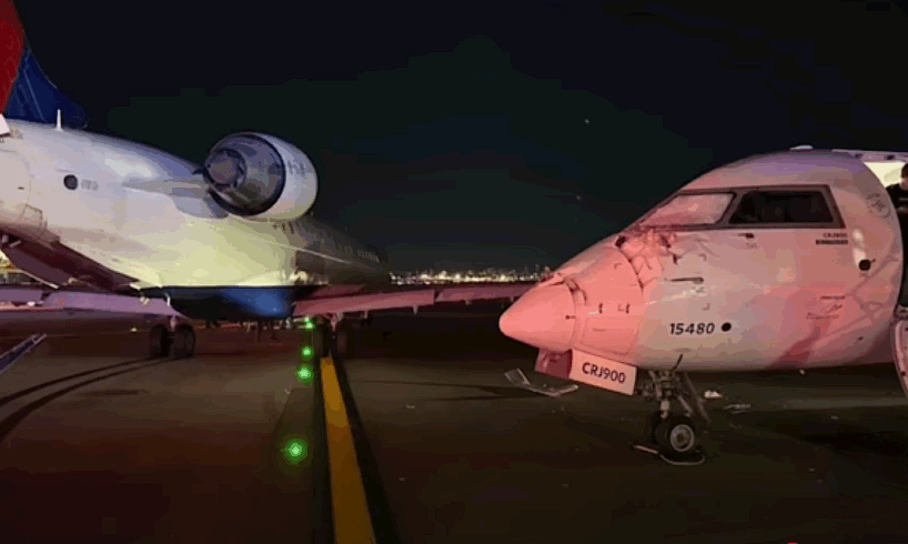 The collision, described by Delta as a “low-speed” event, saw the right wing of the departing Flight 5155 make contact with the fuselage and nose of the arriving Flight 5047. Pilots on Flight 5047 reported damage to the windscreen and cockpit displays, with one passenger describing the impact as “pretty violent” and sounding like “something was being sheared off.” Images of the aftermath show a damaged wing on one aircraft and a shattered cockpit window and deeply gouged nose cone on the other.