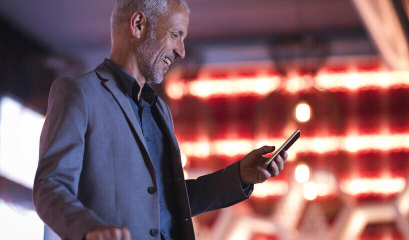 Happy businessman using smart phone while entering the hotel (Delta Air Lines)