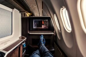 There are integrated state-of-the-art inflight entertainment systems and high-speed connectivity. Air quality has improved, and the cabin is quieter and has better pressurization. Panoramic windows flood the cabin with light, and there is customizable LED mood lighting for ambiance and to reduce jet lag. The lavatories have also been upgraded to be touchless and with antimicrobial surfaces.